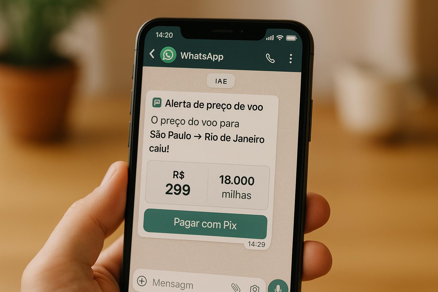IA no WhatsApp transforma alertas de passagens: monitoramento em tempo real, comparação entre dinheiro e milhas, personalização e pagamentos em Pix.